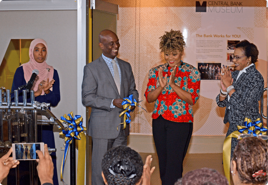 Ribbon Cutting ceremony at the Opening of the remodelled Central Bank Museum From left: Ms. Nimah Muwakil-Zakuri, Curator – Central Bank Museum; Governor Alvin Hilaire; The Honourable Dr. Nyan Gadsby-Dolly, Minister of Education, and Mrs. Nicole Crooks, Senior Manager – Human Resources, Industrial and External Relations.