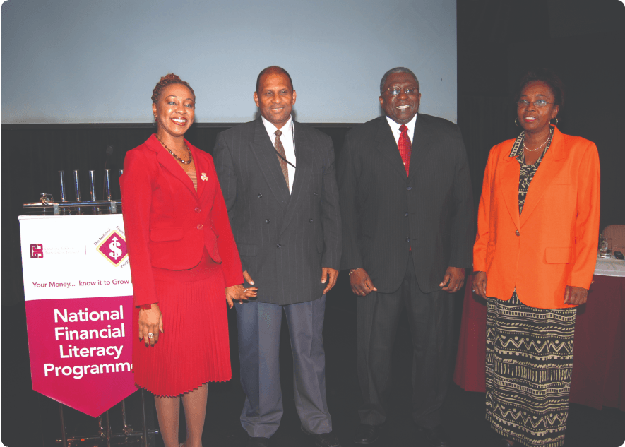 Image taken at the Launch of the National Financial Literacy Programme in 2007. From left: Nicole Crooks, Senior Manager, Human Resource and Corporate Services, Minister of Finance Conrad Enil, Governor Ewart Williams (period), Jennifer Greaves, Senior Manager, Internal Audit & Corporate Governance